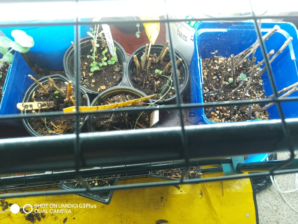 In the end, I carried them into the basement. I placed them under simple shop lights for a few hours every few days. I watered them lightly about every three weeks. I had never tried to keep outdoor cuttings alive this way. It was uncertain, but I wanted to try.